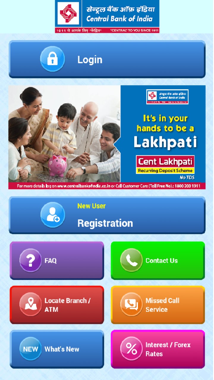 Central bank mobile app. With Central Banks Mobile App it has never been easier to control your finances. Pre login features are accessible to all without registration. Post login features can be accessed by customers of Central Bank of India after completing one time registration process.