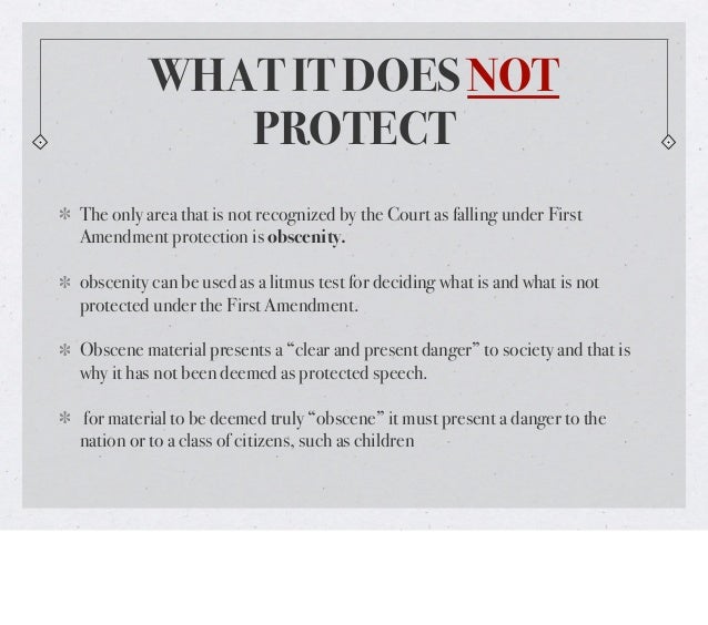 First Amendment to the US. What types of speech are protected by the first amendment. Obscenity is not protected under the First Amendment because these particular types of speeches incite or.