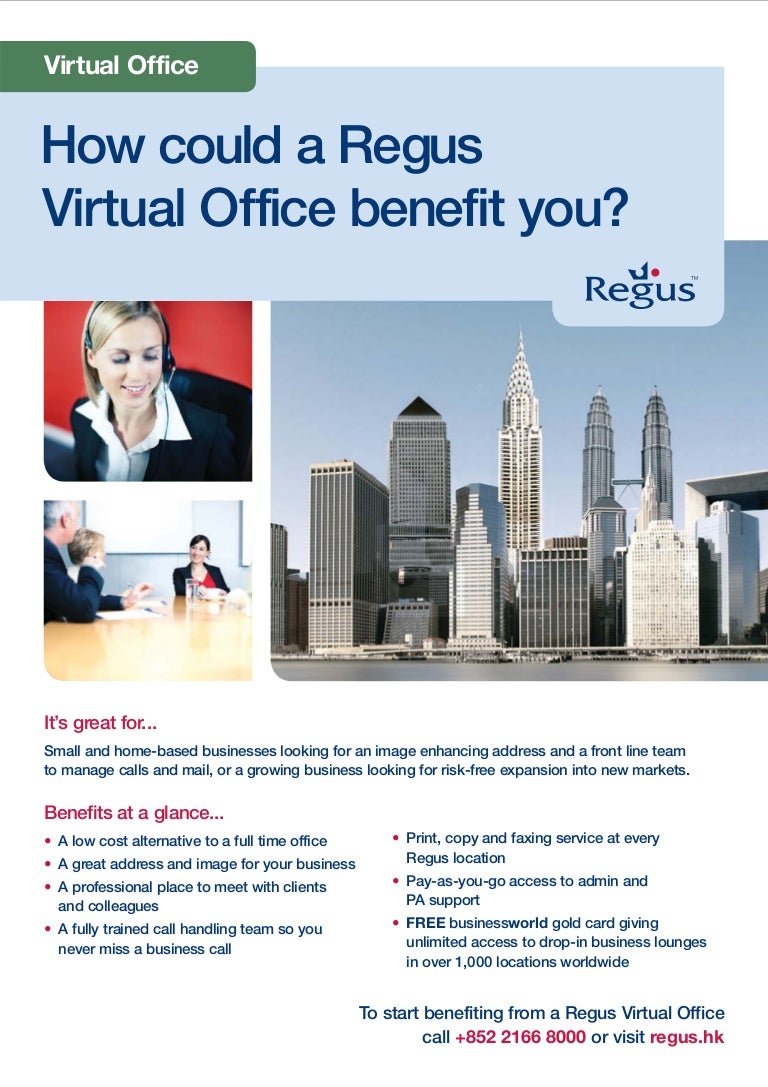 Choose from thousands of locations to position your business wherever you need to be. Local phone number to enhance your local presence. Receive a professional business address with access to mail handling live call answering and business lounge access at any Regus Business Center in the world.